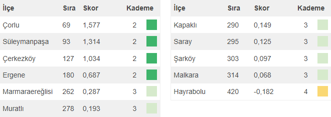 Tekirdağ’ın ilçelerinin ülke sıralamasındaki yerleri ise şöyle: 69. Çorlu, 93. Süleymanpaşa, 127. Çerkezköy, 180. Ergene, 262. Marmaraereğlisi, 278. Muratlı, 290. Kapaklı, 295. Saray, 303. Şarköy, 314. Malkara ve 420. Hayrabolu oldu.