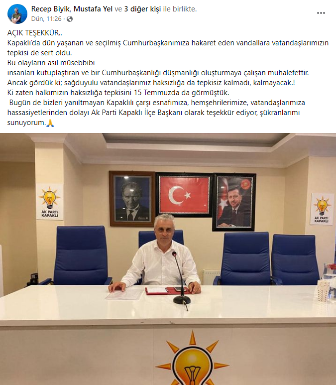 Biyik, açıklamalarında şu ifadelere yer verdi: ” Kapaklı’da dün yaşanan ve seçilmiş Cumhurbaşkanımıza hakaret eden vandallara vatandaşlarımızın tepkisi de sert oldu.