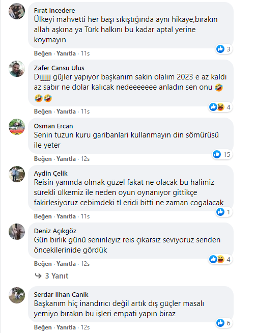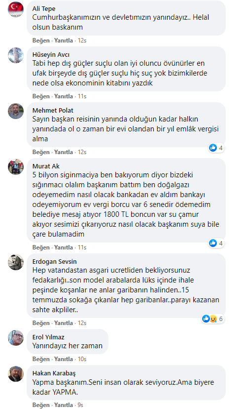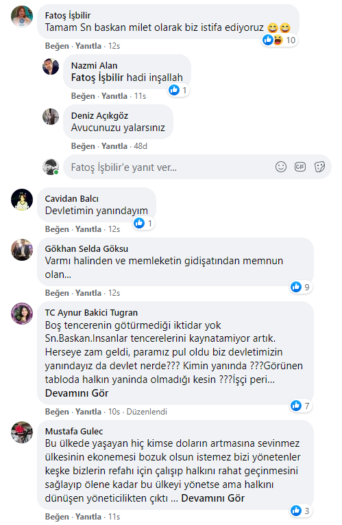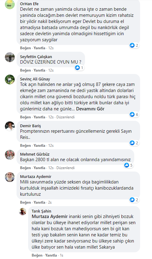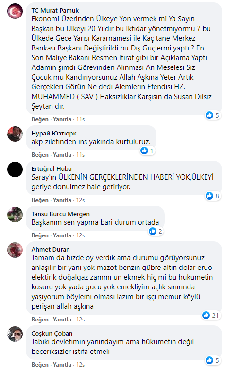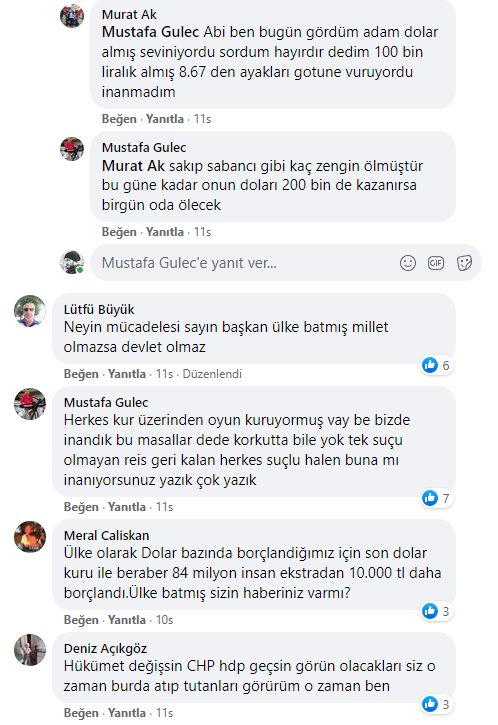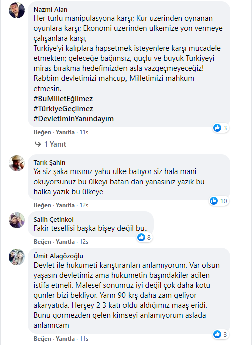 TL’nin hızla değer kaybetmesi karşısında ülkenin bazı şehirlerinde vatandaşlar sokağa dökülerek hükümeti istifaya çağırdı. Bu protestolara karşı atağa geçen AKP’liler de TL’nin değer kaybetmesini yine dış güçlere bağlayarak AKP’li Cumhurbaşkanı Recep Tayyip Erdoğan’ın yanında olduklarını ifade eden paylaşımlarda bulunmaya başladılar.